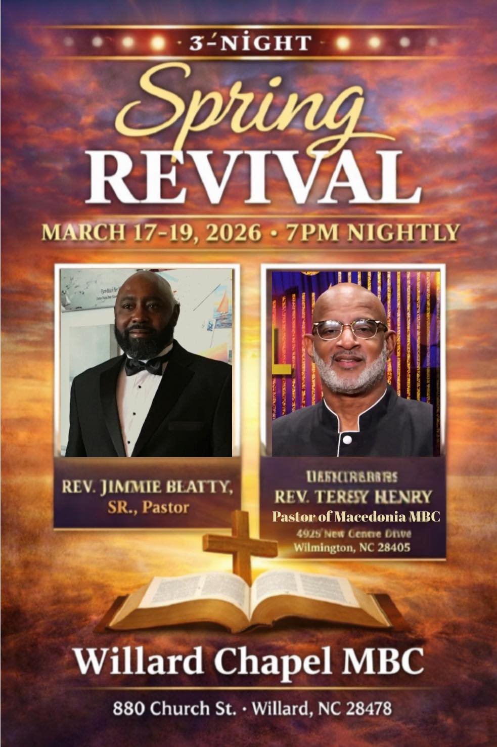 Join Willard Chapel Missionary Baptist Church for a powerful 3-Night Spring Revival on March 17–19, 2026 at 7:00 PM nightly. These special evenings will be a time of worship, encouragement, and renewal through the preaching of God’s Word. Rev. Terry Henry, Pastor of Macedonia Missionary Baptist Church in Wilmington, NC, will serve as the guest...